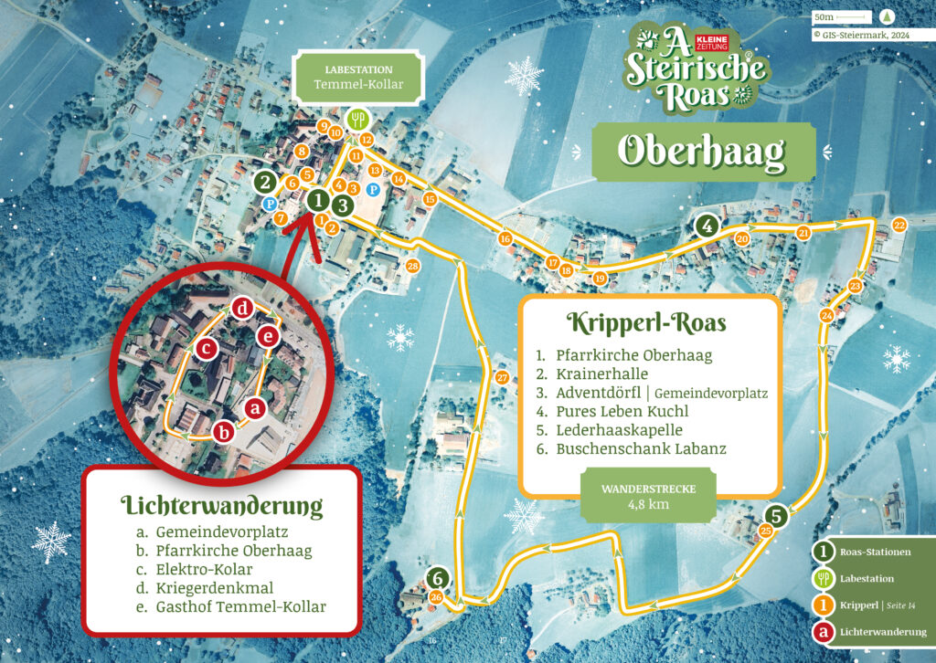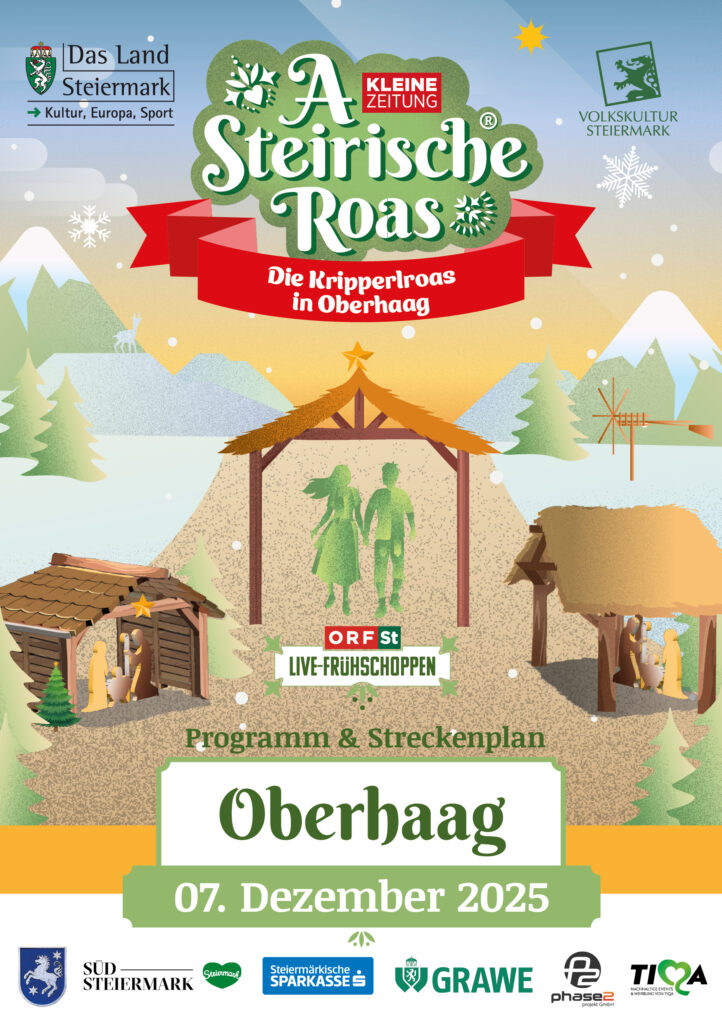 In diesem Jahr wird zum erneuten Mal aus der „Oberhaager Kripperlroas“ und der „Steirischen Roas“ die „Steirische Kripperl-Roas“. Ich freue mich riesig, dass diese Veranstaltung bei uns, in der Gemeinde Oberhaag, in dieser Form stattfindet. Die „Roas“ führt quer durch die Gemeinde Oberhaag und beinhaltet zusätzlich zu den 60 unterschiedlich gestalteten Krippen auch die ein oder anderen volkskulturellen sowie kulinarischen Highlights. Ich bedanke mich bei allen Mitwirkenden und freue mich auf eine schöne und besinnliche „Kripperl-Roas“.